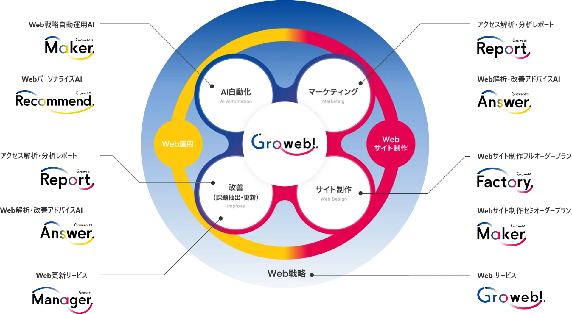 コウズが提供するAI Webサービス『Groweb!Ai』は、2006年から培ってきたWeb運用ノウハウを独自のAI技術に凝縮。